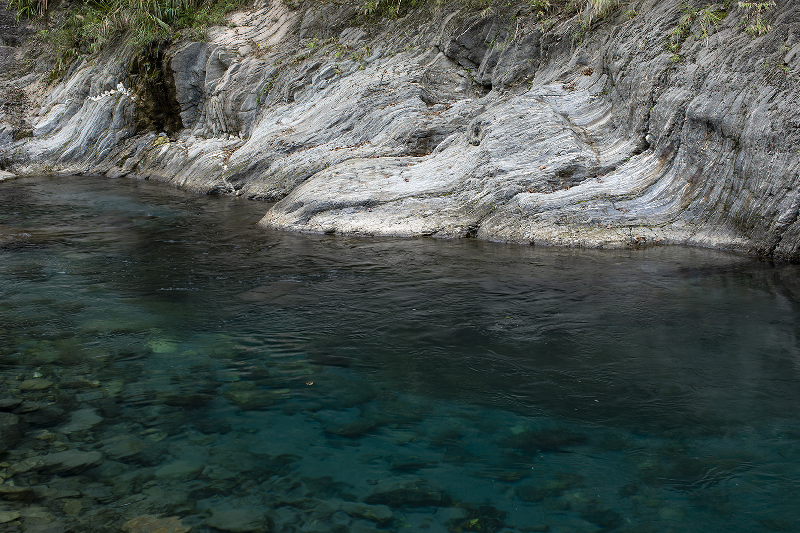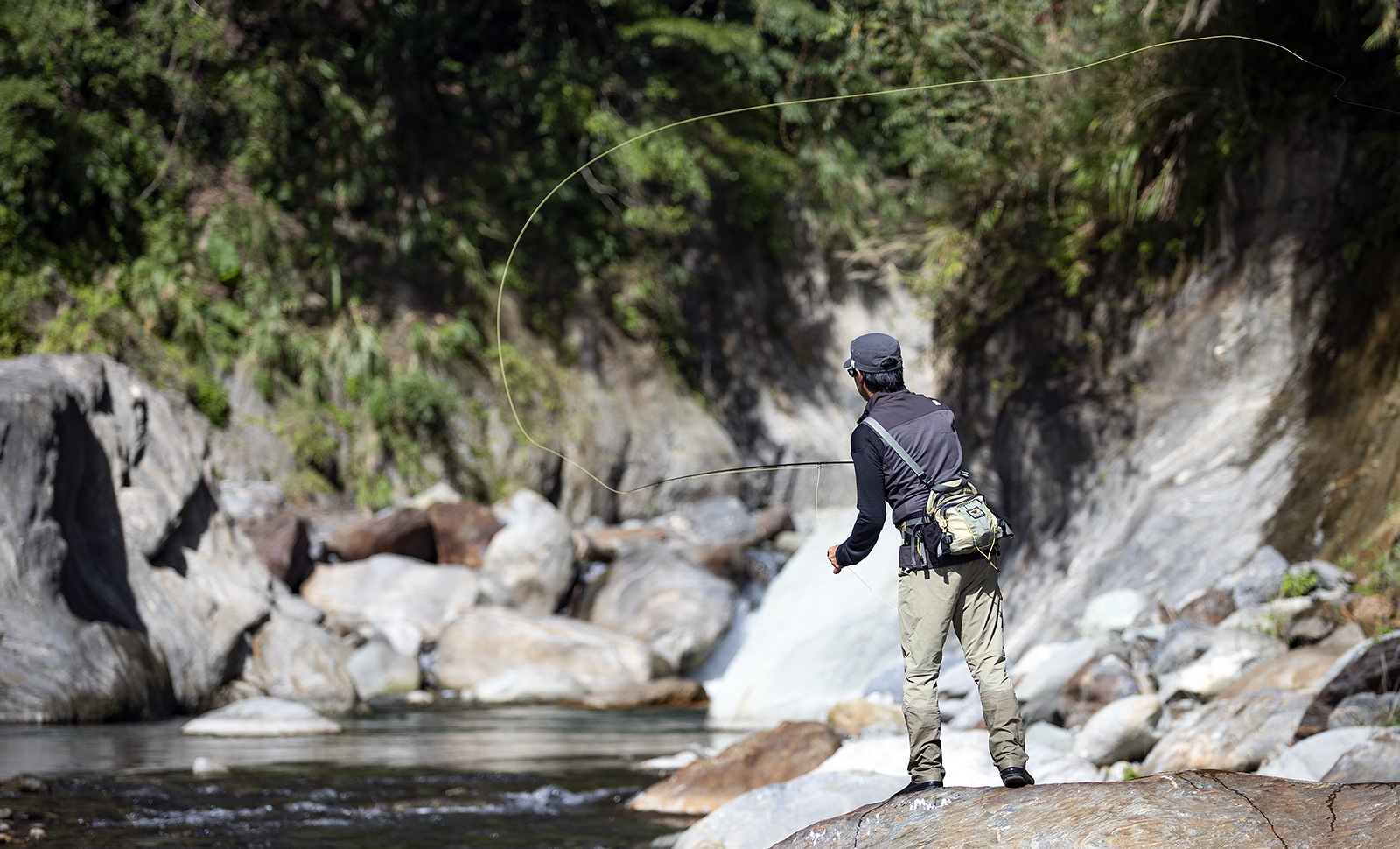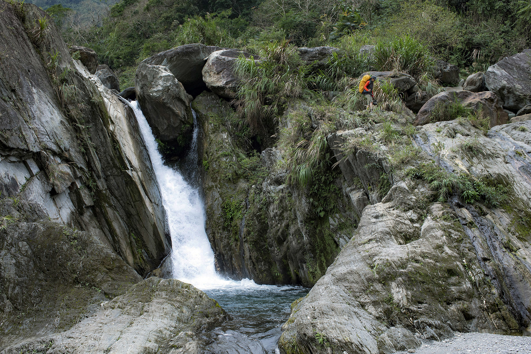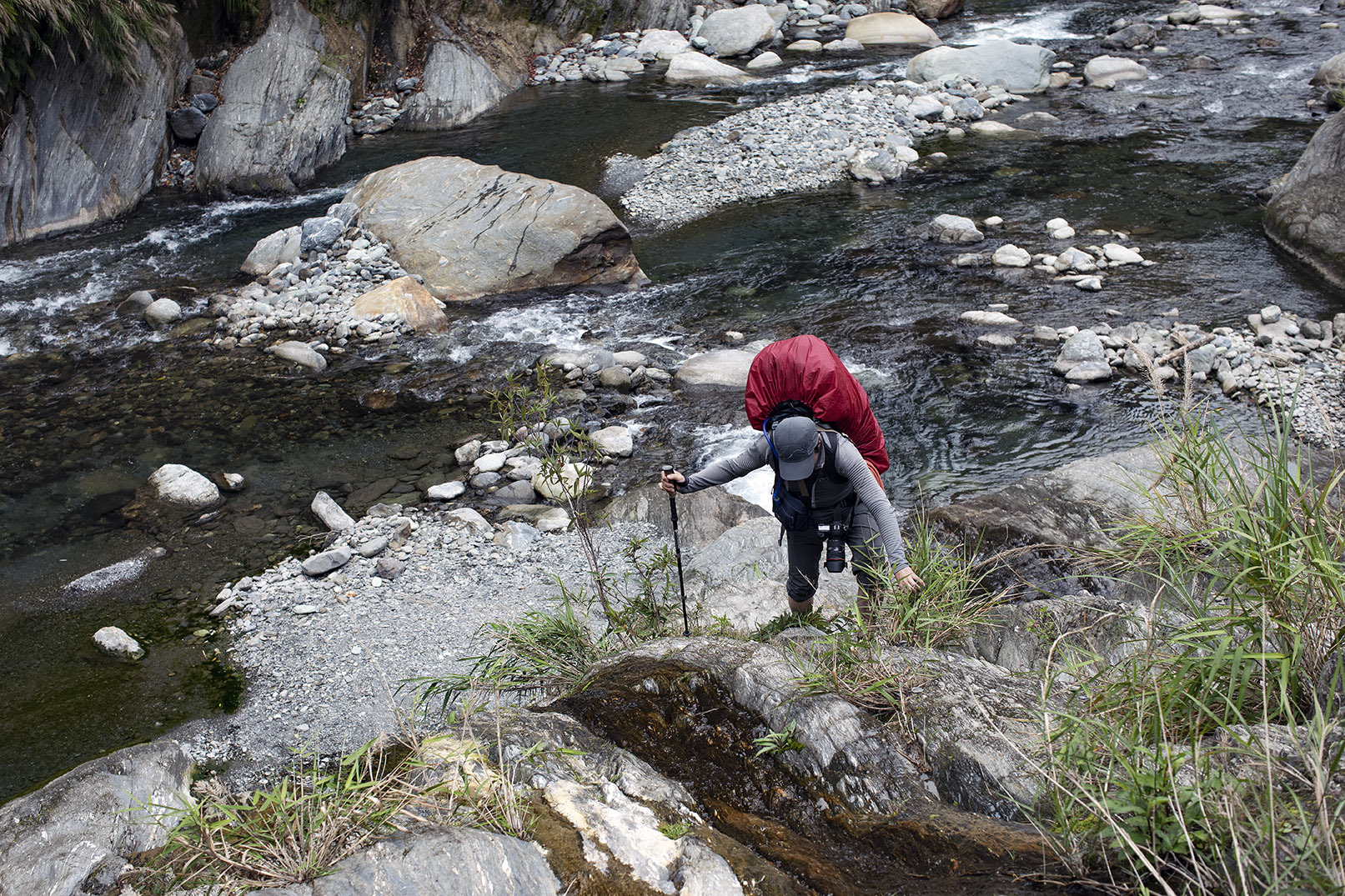 我們是要來釣魚的,離開步道下切合流溪,往南澳南溪方向前進。此地自然地形頗為原始,很久沒來了當然得在溪谷找一下路徑,花了一點時間後,在合流溪匯入南澳南溪的瀑布旁找到一處溪床沙地,這個位置是很不錯的紮營點,搭好天幕、撿拾材火,便開始了溯溪釣魚重頭戲,當然也要順便拍攝些自然景觀。