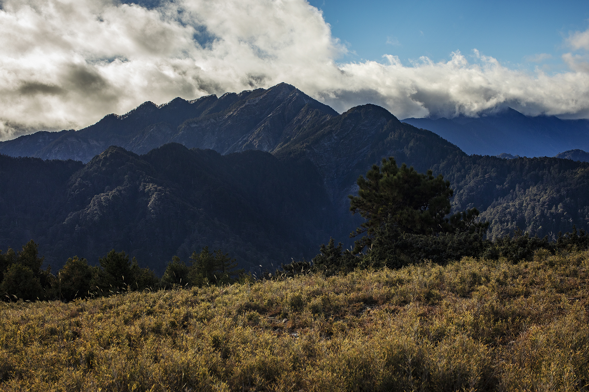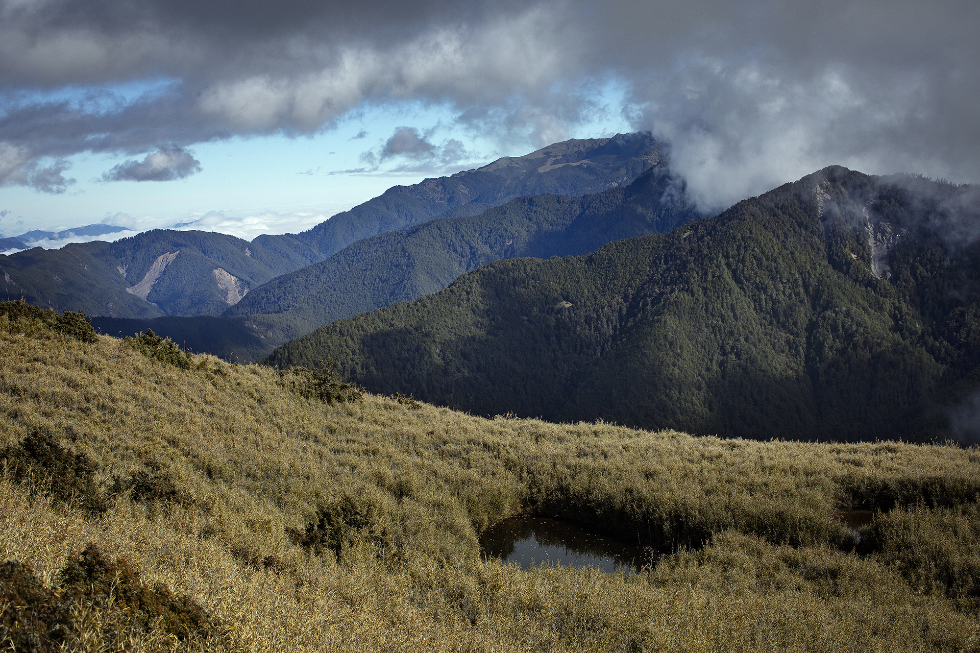 才往上走了第二段陡坡,來到平緩處,雖然順光處的天空非常藍,但是回頭看鈴鳴山的方向卻已經出現烏雲,很快就發現山的那一邊烏雲開始飄雨,而且應該雨勢不小,在高山上可以看得很清楚,大片帶著雨勢的烏雲隨著風勢逐漸往我這裡靠近,地圖看來距離閂山頂還有大概2K要走,這可不妙,因為我們沒帶雨衣上來,而且頭頂上的藍天也逐漸不藍,雲層也開始堆疊起來了,想了又想,還是不要賭運氣了,萬一真的遇到下雨沒有雨衣褲鐵定很慘,還是快快下撤回到大背包旁邊吧。東西收拾完畢後,也不想繼續紮營了,乾脆去民宿洗熱水澡吧!結果就這樣一路走出來,但天氣愈走愈好……,哎!下次再來吧!