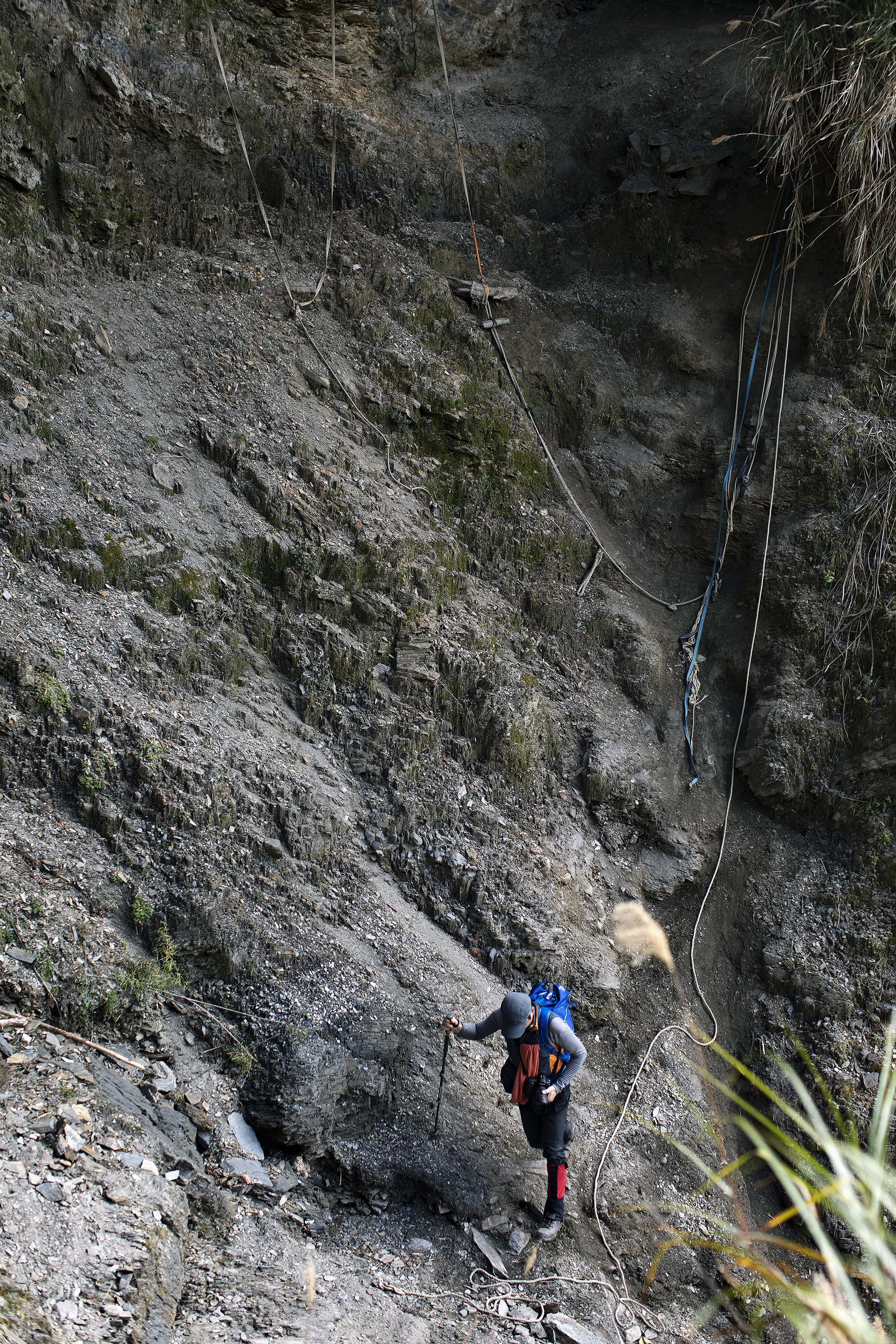 林道上另一處較大規模的崩坍處在26K處,現場同樣也有架繩,但從架繩的型態和固定點的位置來看,應該也是因為落石崩塌持續,所以繩索分為多段架設,現在的下切與上攀呈現角度很大的V字形,由於前往此時天候還不錯,踏點都算紮實,所以拉繩上升或下降並不難,不過臂力和握力得足夠,開始通過地形時可不能失手,而且要拉繩之前,繩索的狀況務必要仔細判斷確認。由於這段崩坍不算太過危險,所以在天氣良好時應該都可以通過,不過這段崩坍的上方已有開出高繞路,並不高也沒多遠,多花一點時間和力氣高繞無妨,尤其是遇到下雨時,高繞可避開不必要的風險。