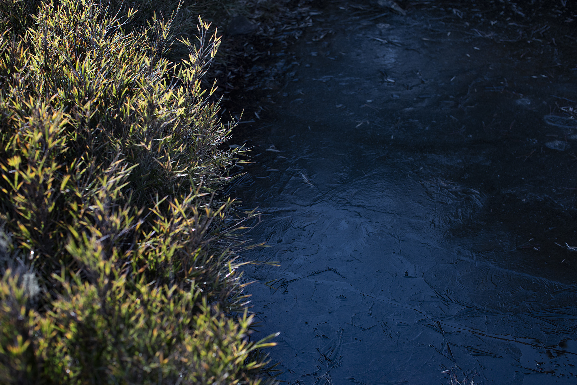 一旦進入登山口開始陡上,那就得走上稜線之後才會遇到幾處看天池,冬季此時稜線上的水池大部分都已結冰,必須以登山杖尖用力才能戳破冰面取水,不過看天池的水質都不好,必須以濾水器過濾才能飲用。