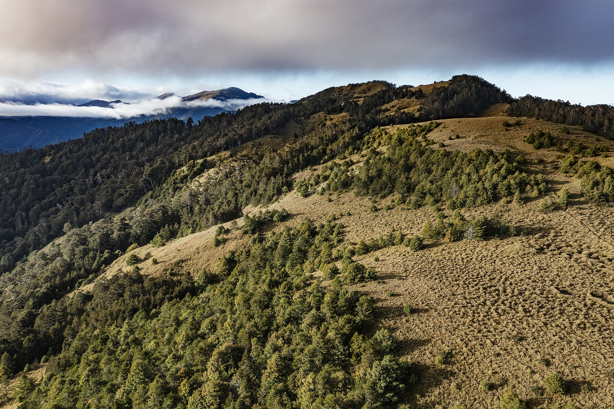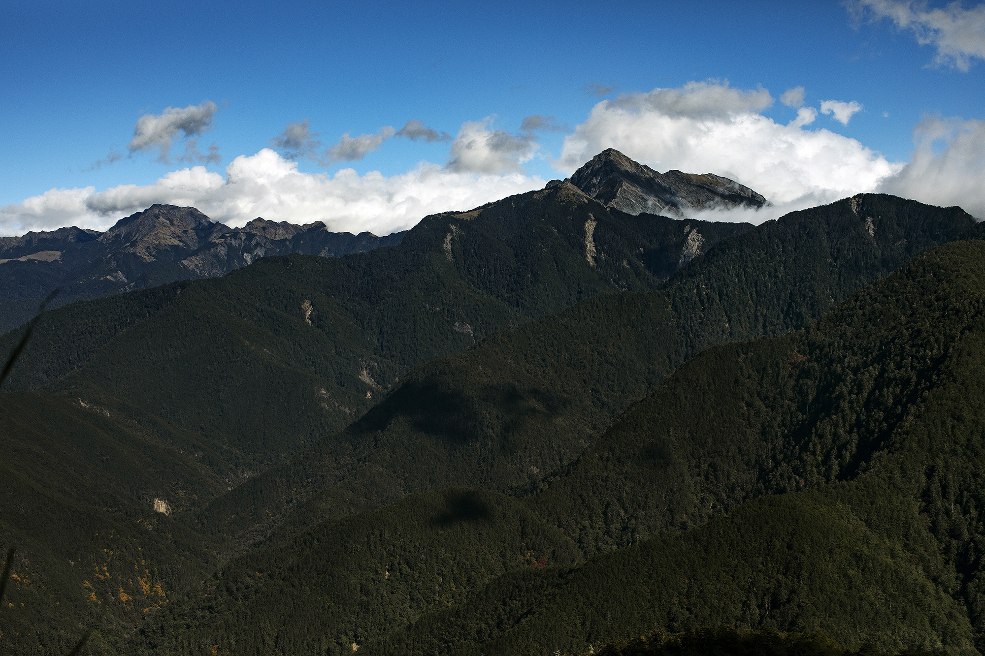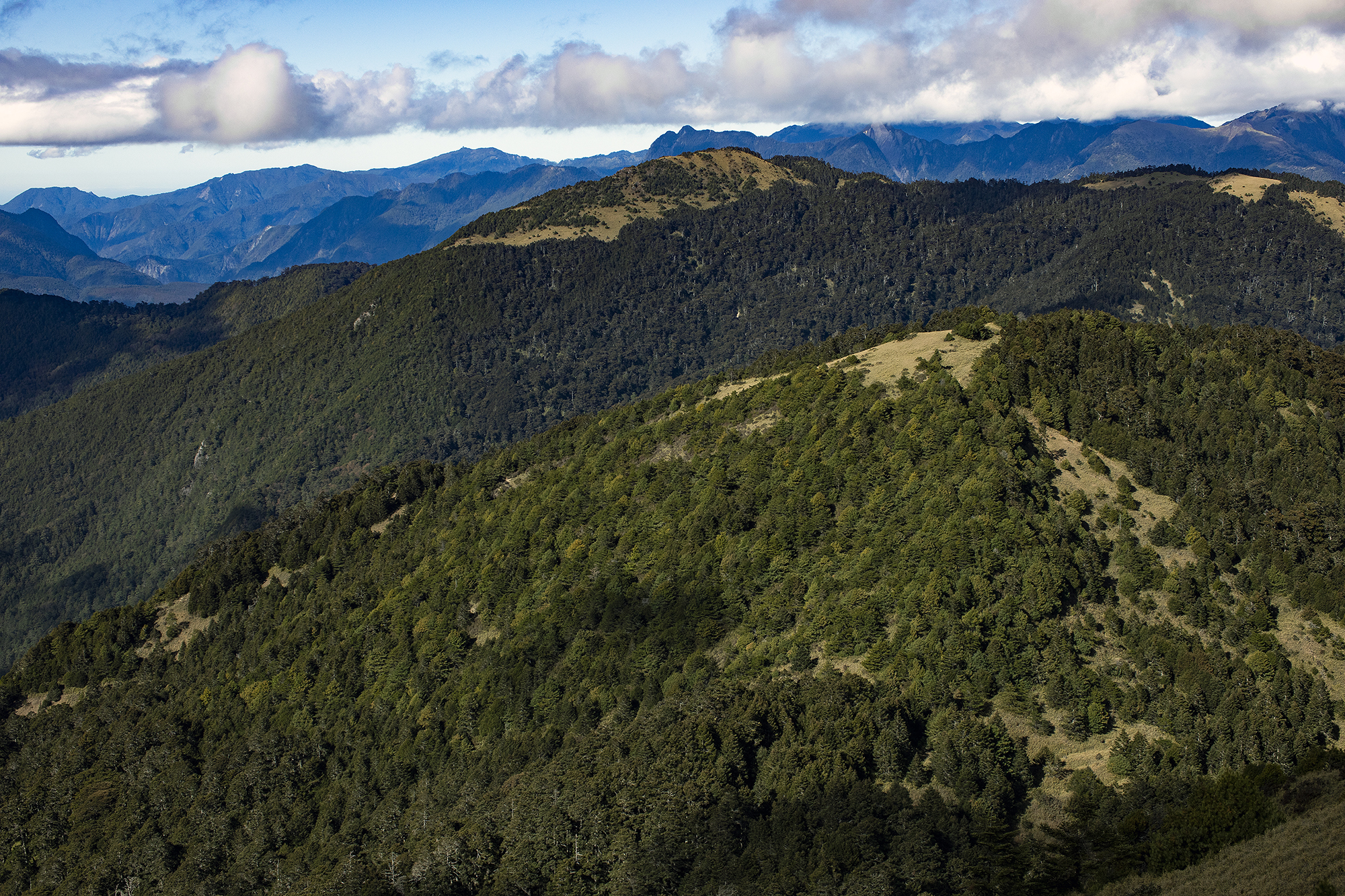 通過人待山北峰之後的路徑坡度較緩,鑽箭竹的狀況差不多到人待山為止,之後的稜線上視野展望就很不錯。此行最精華的路況就是從人待山往鈴鳴山的這段稜線路徑,如果天氣夠好,周圍名山可一覽無遺,不過這趟雖沒有遇到下雨,但是雲層還是太厚,中央尖山、南湖大山等山頭都淹沒在雲霧裡,只有畢羊縱走的各大山頭有看到一些,不過雲霧飄動的很快,還是能在短暫的瞬間瞄見更遠方的展望。