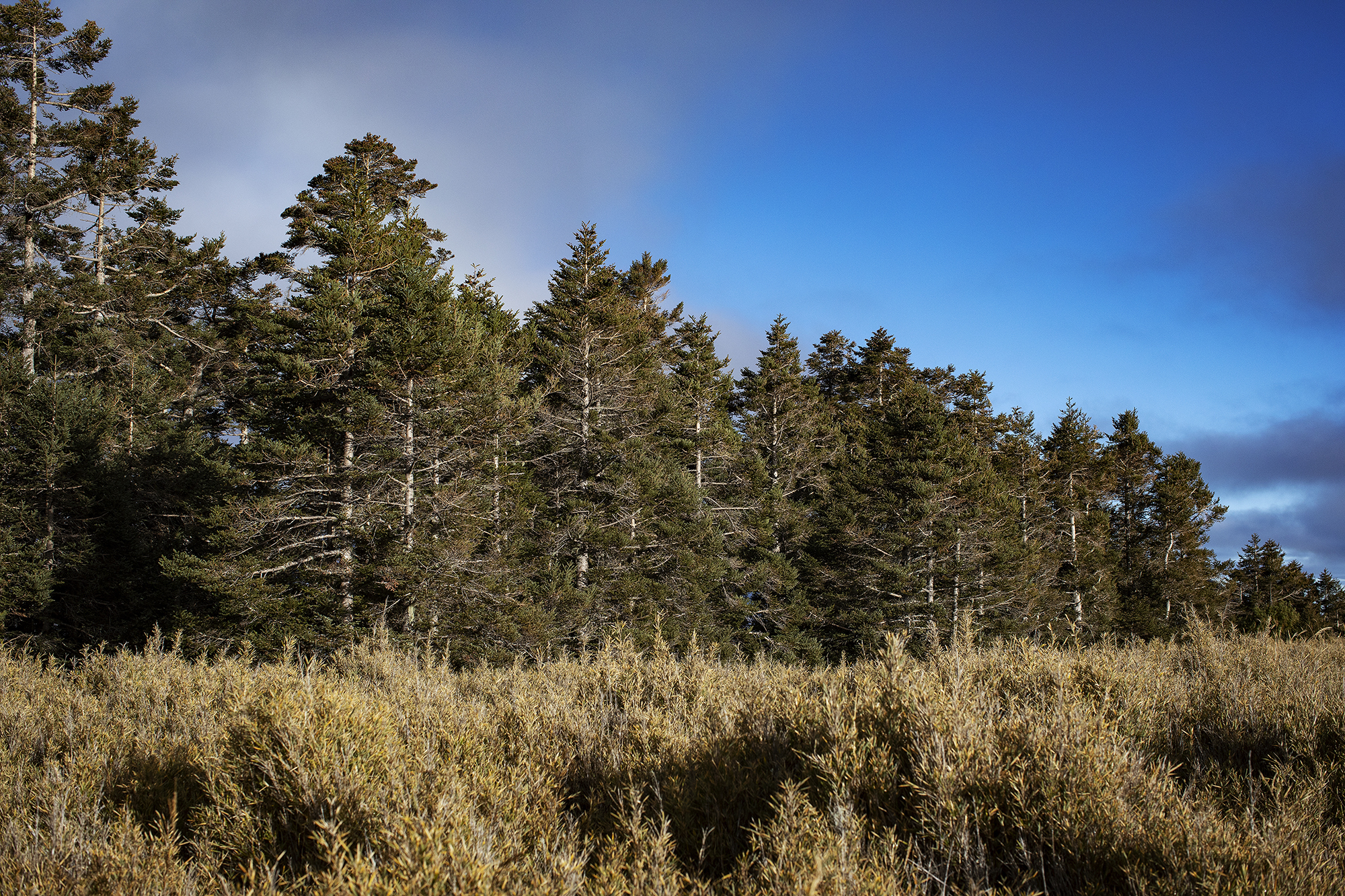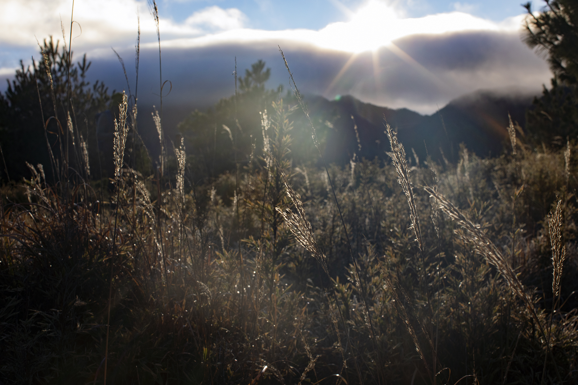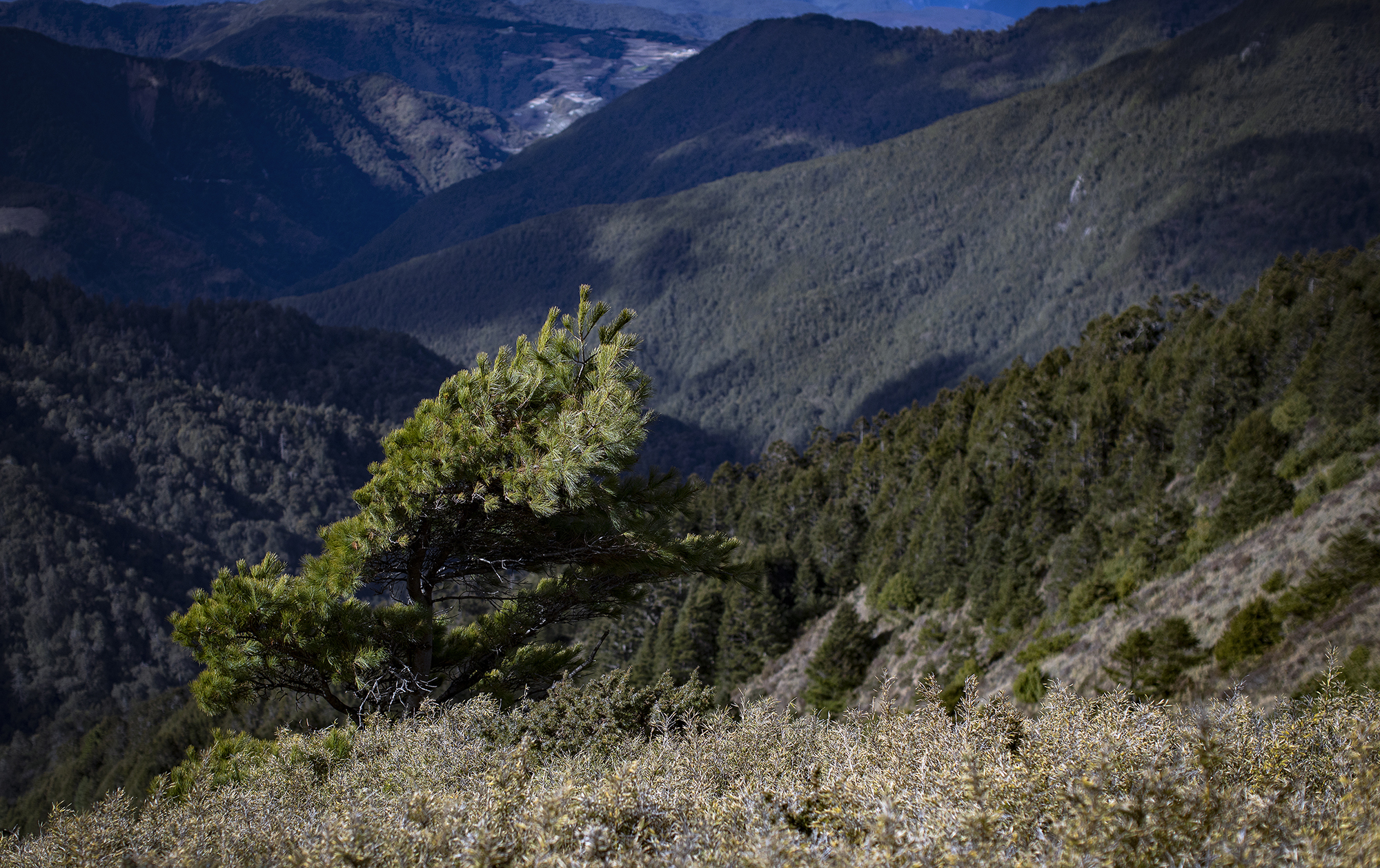 從走上和緩的稜線開始一直到鈴鳴山頂,視野展望就非常良好,四周名山一覽無遺。不過在走上稜線之前的很大部分路段包括在林道上,都得穿梭在茂密且高度比人再高一些的箭竹叢裡,這段頗為“阿雜”的距離不短,至少在開始陡上陡下的路徑上幾乎都是這樣。夜裡凝結的冰霜覆滿在箭竹的每一片枝葉上,人穿梭在箭竹林下就像是被徹底的刷洗,當受到陽光照射氣溫升高後,灌叢中滿滿的都是冰冷水珠,衣物要保持乾燥很難……。