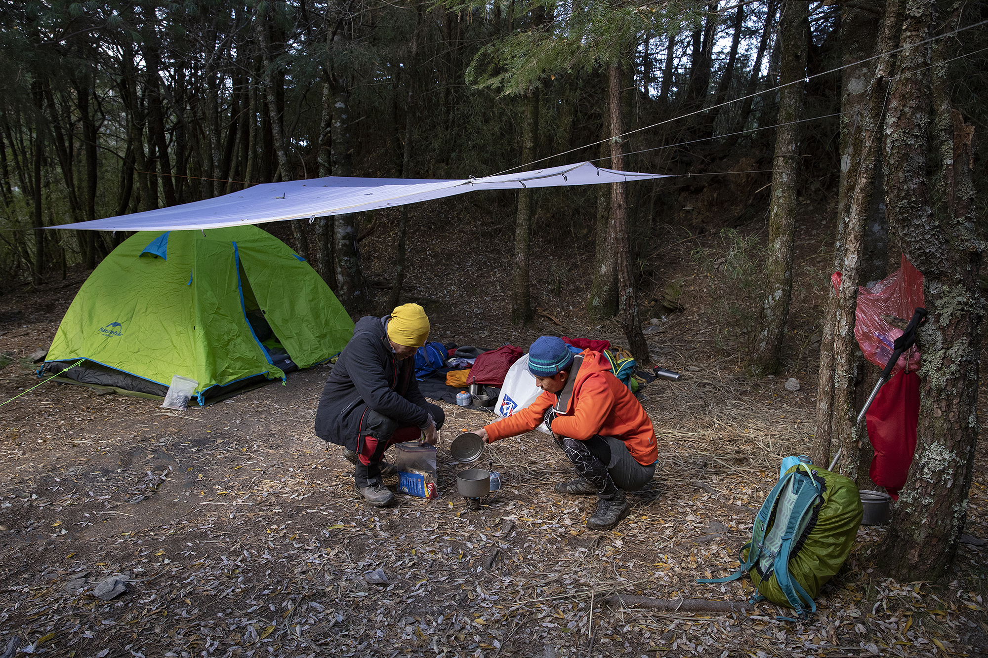 在林道24K處水源前有塊腹地足夠搭二、三頂二人帳,周圍皆是樹林,我們以營繩將天幕吊掛在樹幹上,並覆蓋了帳棚1/2的面積,很輕易的就營造出野炊吃喝的空間。