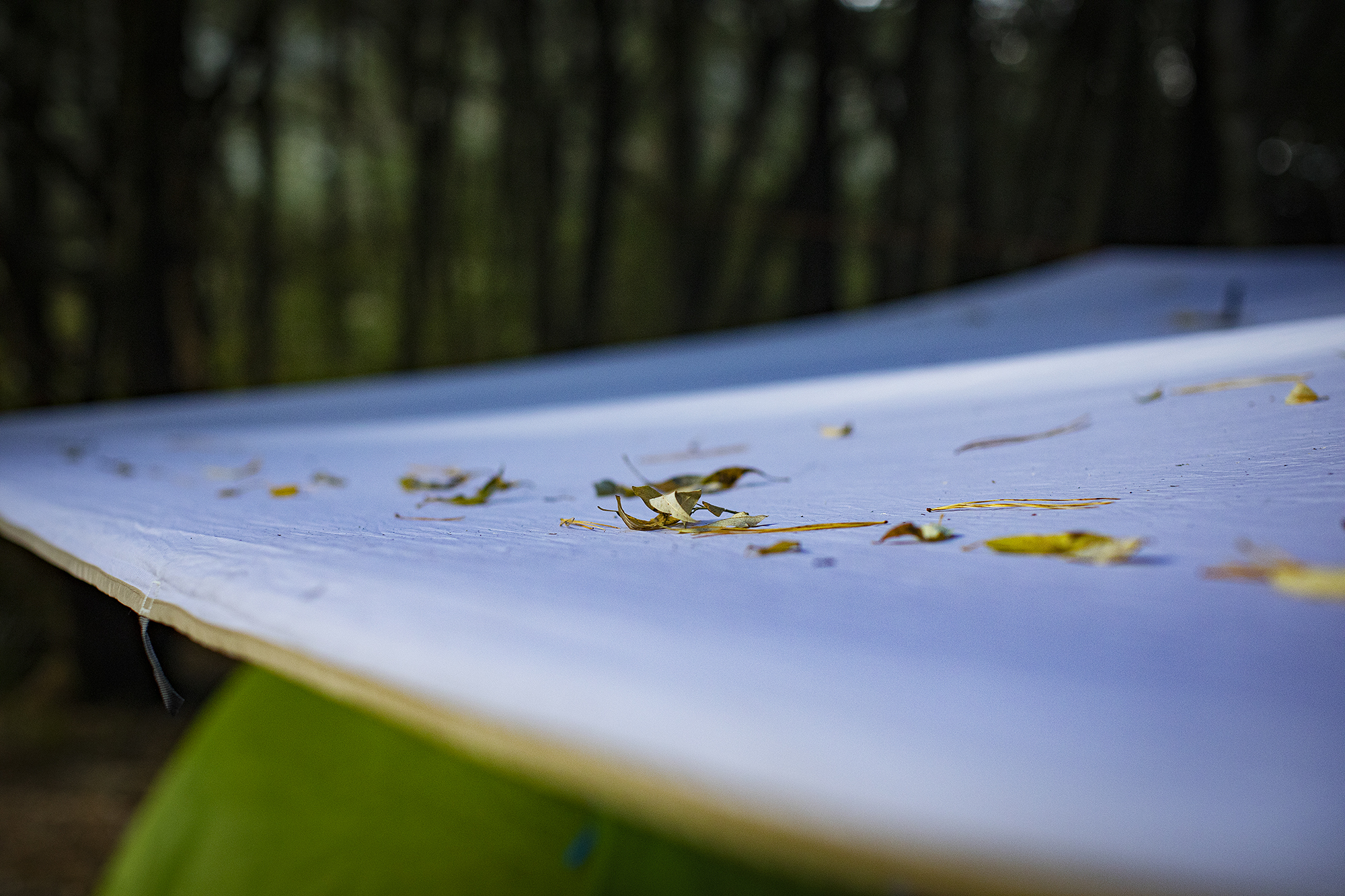 這頂Tarp-370天幕帳採用30D尼龍66高強力紗織造,雙面皆為矽膠塗佈,和常見的PU塗層天幕差很多,PU塗層的使用壽命不長,雖然防水性尚可,但是一般約莫2-3年後很容易就會發現塗層變得會沾黏,這就是老化的現象,雖然布料本身沒有壞,但此時已經不防水,而且會愈來愈黏,然後逐漸脫落。而雙面矽膠塗層則不易發生這個問題,使用壽命長很多。