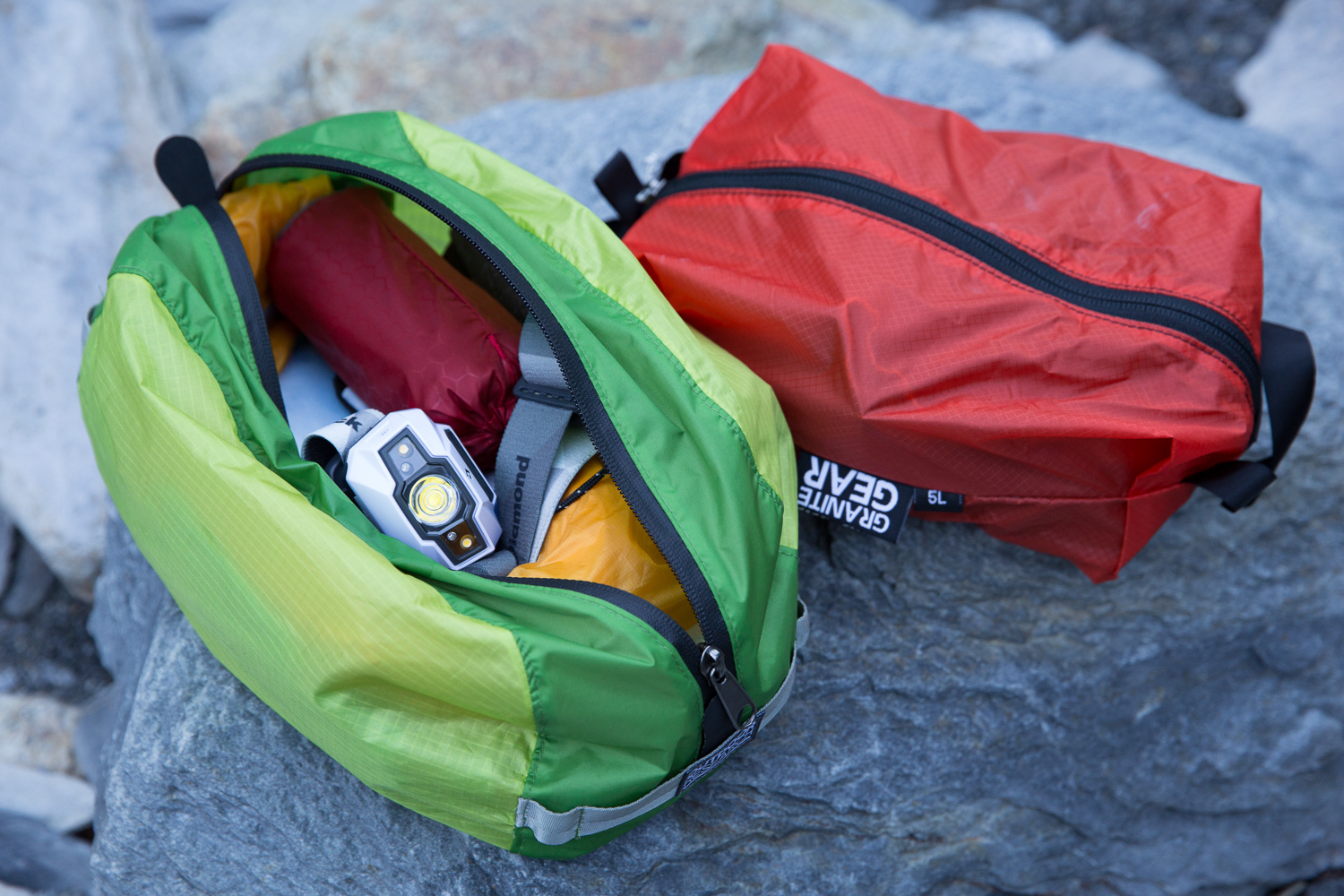 頭燈、行動糧、手套、帽子、藥品之類的東西要放置在頂袋,一個正常的背包一定有水瓶、登山杖等物的固定收納的位置,必要時還可以運用織帶與扣具額外再加掛其他物品,例如雨傘、外帳等。因此,你需要好幾個小型的防水收納袋,將上述物品分類收納完畢後,逐一全部放入大背包裡。另外再帶一個小容量的登頂包,在登頂的那一天帶著當天需要的物品。