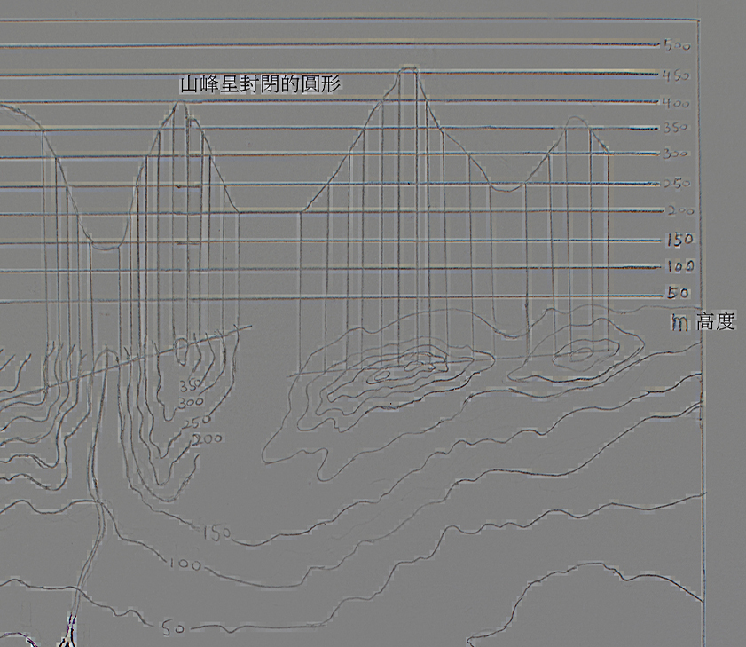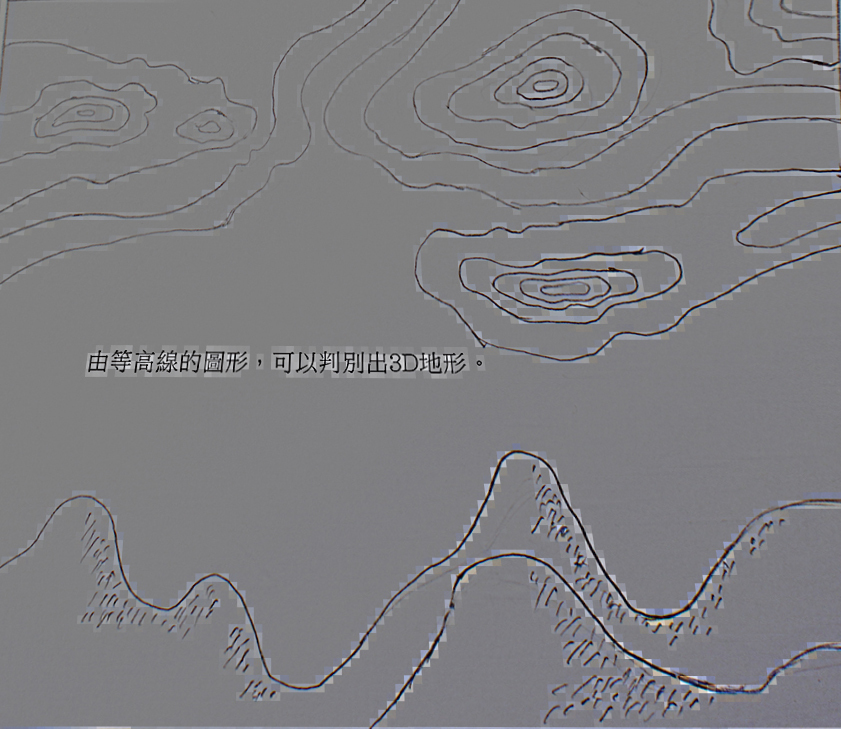 1.每一條連續的線條,代表相同的高度,所以一座山峰一定也是圍成一封閉的圖形,這圖形面積愈小,即表示山頂愈尖銳。